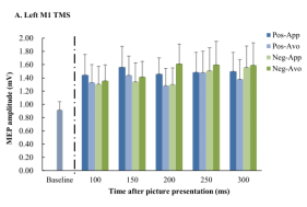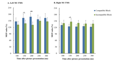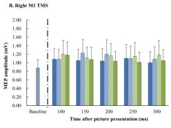 研究结果首先从行为水平上验证了基于自我认知的情绪性刺激反应兼容效应,即相容行为反应时显著快于不相容行为(如图1)。从电生理学水平上,揭示了左侧M1在情绪图片出现150 ms和200 ms时,消极回避的运动诱发电位(motor-evoked potential,MEP)振幅显著大于消极趋近任务;200 ms时,积极趋近的MEP振幅显著大于积极回避任务(如图2A)。此外,在150 ms和200 ms时,左侧M1在相容任务中的MEP振幅显著大于不相容任务(如图3A)。而在右侧M1中则有不同的发现。结果显示,右侧M1在情绪图片出现后150ms,消极回避的MEP振幅显著小于消极趋近任务(如图2B);并且相容任务的MEP振幅也显著小于不相容任务(如图3B)。