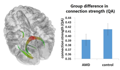 结果显示,在扩散加权图像的脑连接图的直接分组比较中,AMD患者的定量各向异性值(QA)明显弱于健康对照组。AMD组和对照组在认知表现上没有显著差异。在所有参与者中,较好的认知表现(例如,语言流利性)与白质束更强的连接强度相关。然而,组别与认知表现(言语流利性、记忆力)之间存在显著的交互作用,这表明AMD患者的QA与认知表现的关系弱于对照组。