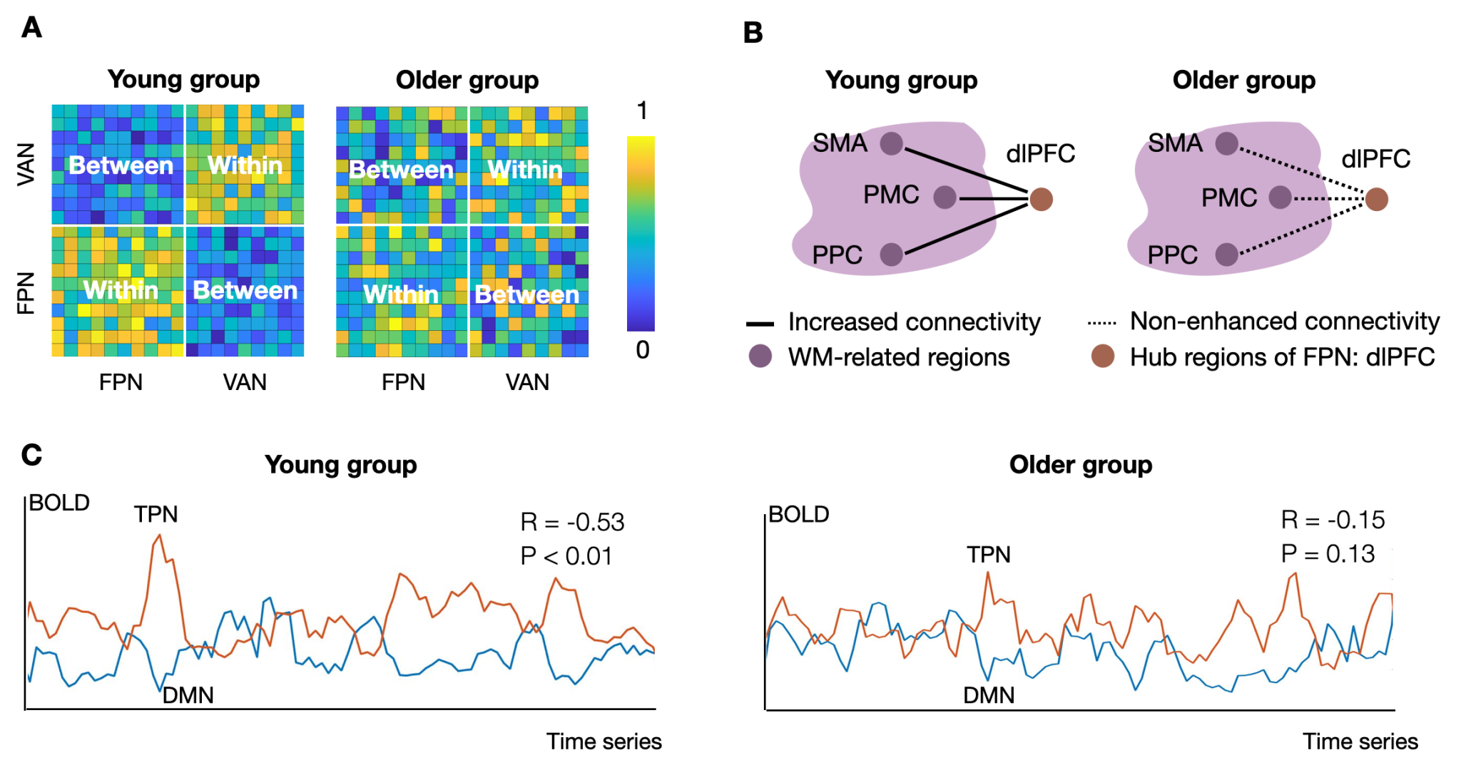老化导致大脑网络功能协同损伤。额顶网络到任务特异性脑区的功能协同损伤与认知控制老化有关。在字母N-back任务中,年轻组表现出了负荷依赖的功能连接增强,而老年组并未表现出脑区协同加强,提示了老化相关的功能协同受损(图1B)。这种功能协同损伤通常发生在额顶网络的枢纽脑区(e.g.,dorsolateral prefrontal cortex,dlPFC)到任务特异性脑区之间(Nagel et al., 2011)。