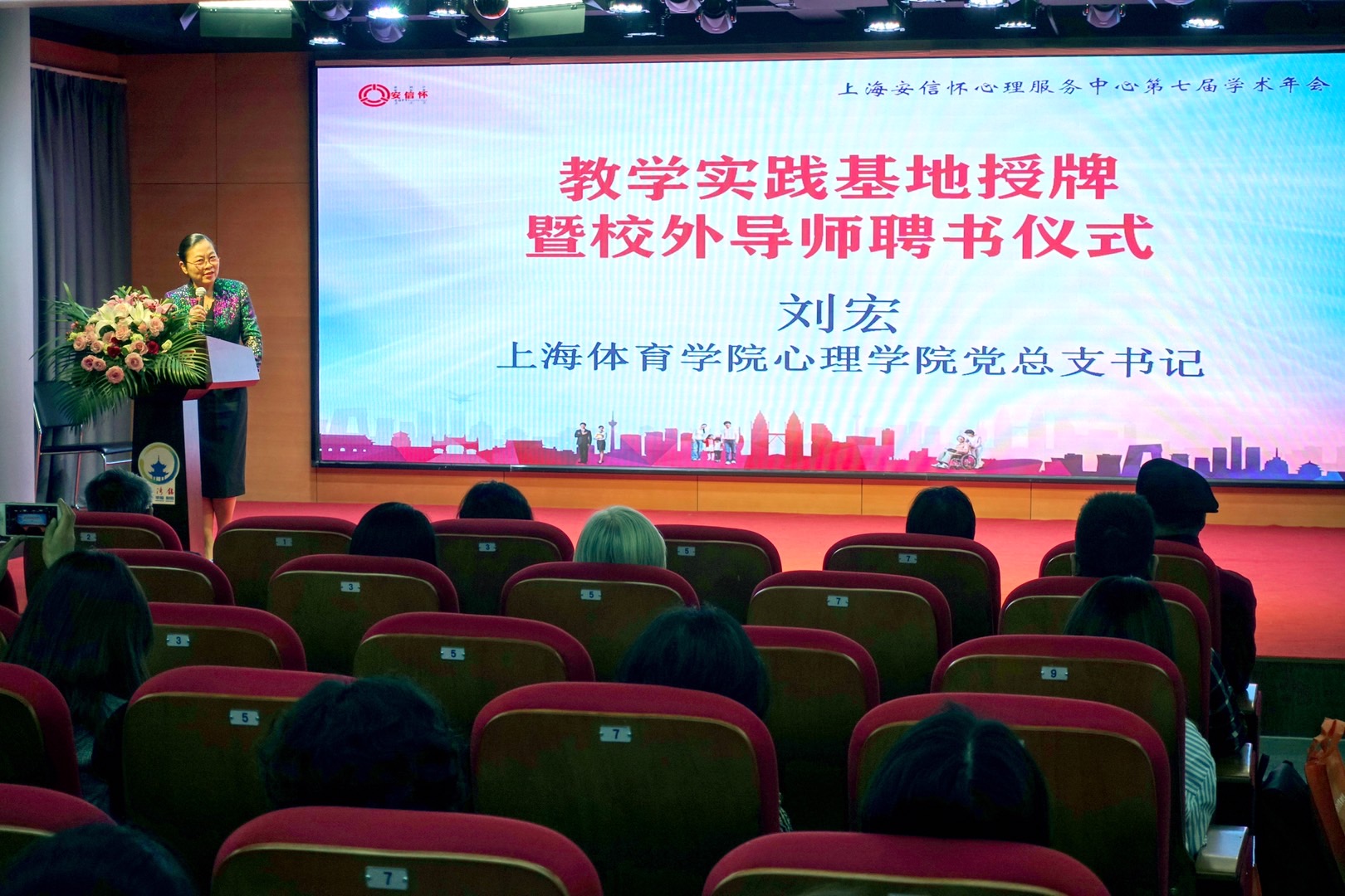 上海体育学院今年会jinnianhuicom党总支书记刘宏为安信怀心理服务中心授牌,并为理事长周祝慧颁发校外导师聘书。