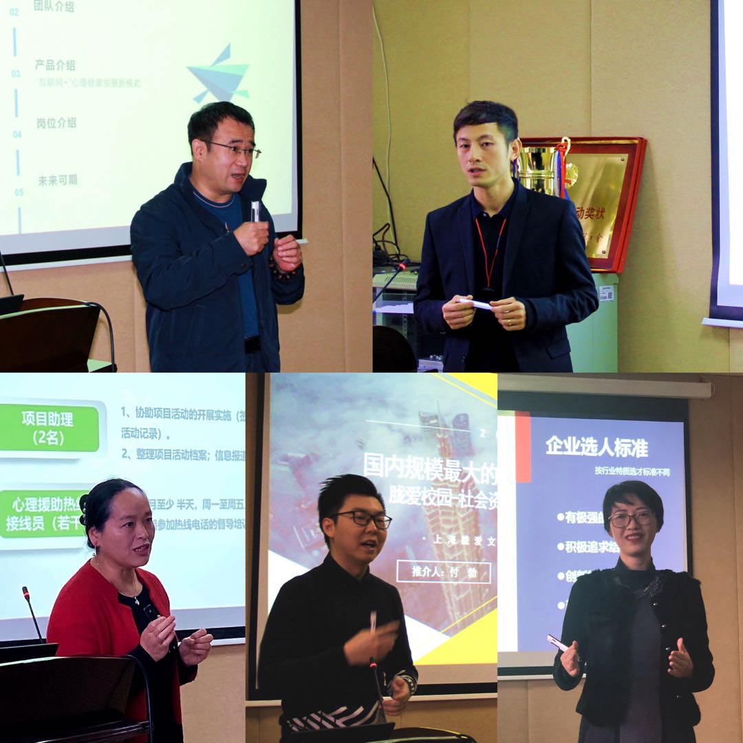 宣讲会上,各企业代表为毕业生详细介绍了公司发展情况、招聘条件以及行业人才需求状况。上海胧爱文化传播有限公司联合创始人付勃先生,通过公司深度融合沪上高校大型文化活动的文图介绍展示,欢迎青年学子来胧爱——未来事业发展的孵化器就业”。安信怀心理服务中心是一家注册在虹口区民政局的3A级社会服务机构,董事长周祝慧女士结合服务妇联、团委、社区、学校的多个案例,为毕业生提供就业实习岗位和推荐机会。作为我院教学实践基地,大型国有企业上海久事智慧体育有限公司战略投资部经理王法先生,分享了运动心理学在足球项目中的应用,欢迎和鼓励毕业生加入到智慧足球系统平台计划中。作为国内第一家心理学行业上市公司,北辰软件股份有限公司总经理杨朝辉先生在介绍互联网+心理学的企业优势之后,还结合多年职场感受,从一般技能、专业技能及工作态度上,给予求职者以中肯的建议。民族美妆品牌伽蓝(集团)春夏培训总监李陈艳女士以“初入职场的友好”为主题,与毕业生分享和互动了企业选人用人的标准,介绍了伽蓝管培生培训方案,以及招聘面试技巧等实战的求职经验。