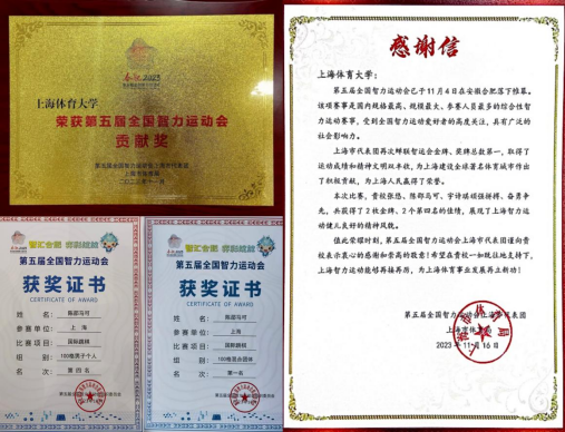 11月4日,第五届全国智力运动会在安徽合肥落下帷幕,上海市代表团获得13枚金牌、9枚银牌、9枚铜牌,蝉联智力运动会金牌总数和奖牌总数第一名,取得运动运动成绩和精神文明双丰收。我院学子陈邵马可与队友(继续教育学院张悠、竞技运动学院宇诗琪)一同代表上海出战本届智力运动会,经过顽强拼搏和奋勇争先,最终以一枚团体金牌,个人第四名的优异成绩,为上海代表团和学校增添了荣誉。