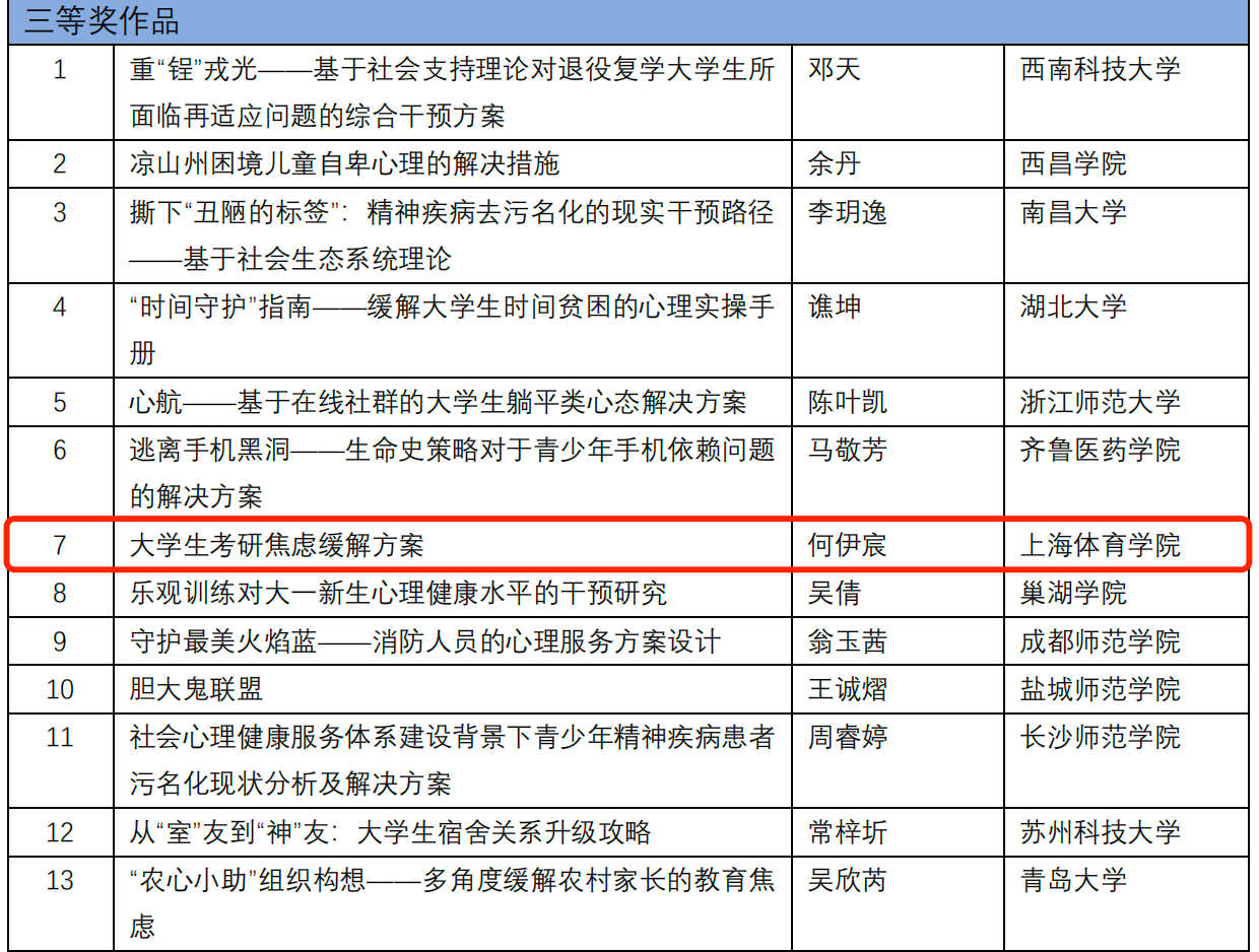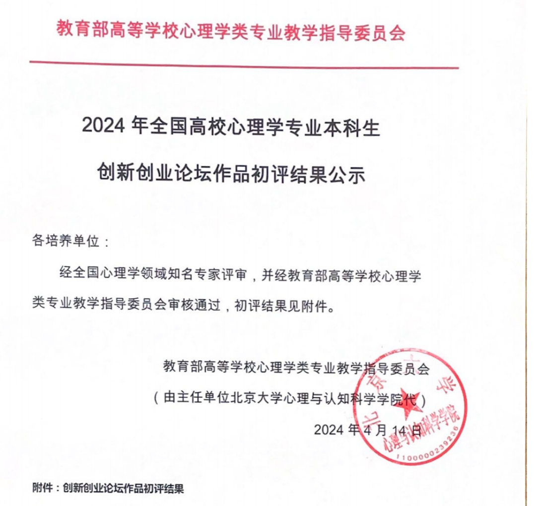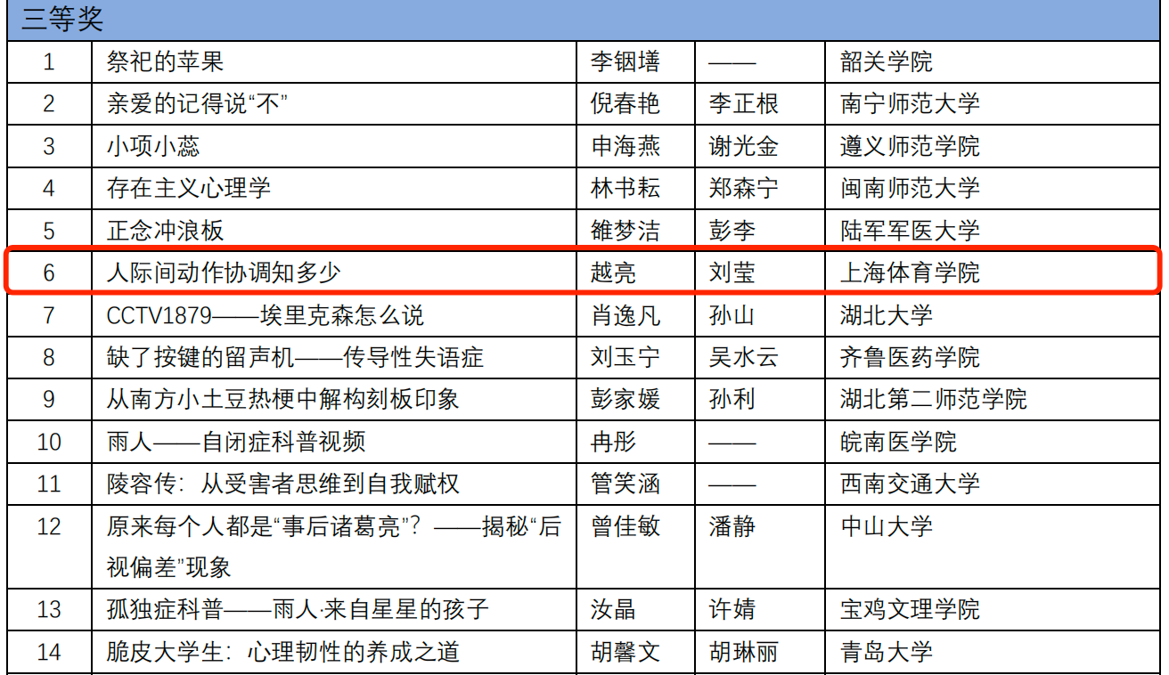 2024年4月15日,由教育部高等学校心理学类专业教学指导委员会主办的2024年的全国高校心理学专业本科生创新创业论坛发布了第二轮评审结果。此次论坛涵盖心理实验设计、现实问题解决、心理学产品设计、心理科普短视频四个分论坛,我院何伊宸同学的作品《大学生考研焦虑缓解方案》荣获“现实问题解决分论坛”三等奖,由刘莹老师所指导的越亮小组的作品《人际间动作协调知多少》荣获“心理科普短视频分论坛”三等奖。