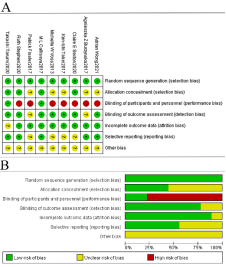 此外,应用Cochrane 2011工具对纳入研究的偏差风险进行了评估,这一工具专门用于评价随机对照试验的质量,包括随机序列生成、分配隐藏、结果评估的盲法等方面(图2)。在数据分析阶段,本研究利用Stata 15.0软件进行了荟萃分析,并通过森林图和漏斗图进行了视觉分析。所涵盖的统计分析结果包括分数各向异性(Fractional Anisotropy, FA)、径向扩散(Radial Diffusivity, RD)、平均扩散(Mean Diffusivity, MD)、白质体积(White Matter Volume, WMV)、海马体积(Hippocampal Volume, HV)、执行功能(Executive Function)、记忆(Memory)和加工速度(Processing Speed)等多项关键指标。