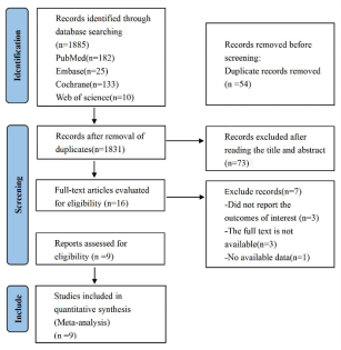 本文遵循了“系统评价和荟萃分析报告优选条目的方法指南”(Preferred Reporting Items for Systematic Reviews and Meta-Analyses, PRISMA),从PubMed、Embase、Web of Science等数据库中进行了广泛的文献搜索。采用基于循证医学的“患者、干预、对照、结果和研究设计”(Population, Intervention, Comparison, Outcomes, and Study Design, PICOS)框架作为纳入研究的选择标准,从1885篇文献中筛选出相关的随机对照试验(Randomized Controlled Trials, RCTs)(图1)。排除了非临床试验、无法获取全文、重复发表和质量低下的研究。使用EndNote软件和标准化数据提取表格确保了数据提取的准确性和一致性。